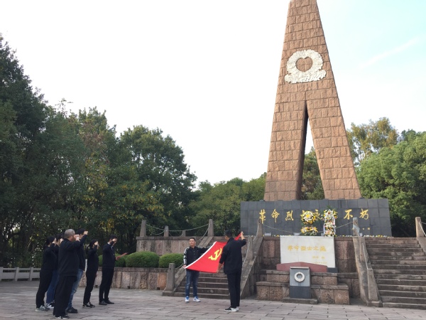 参观结束后,支部成员步行至“革命烈士永垂不朽”纪念碑前,面对鲜红的党旗,党支部书记黄炜带领全体党员重温入党誓词。