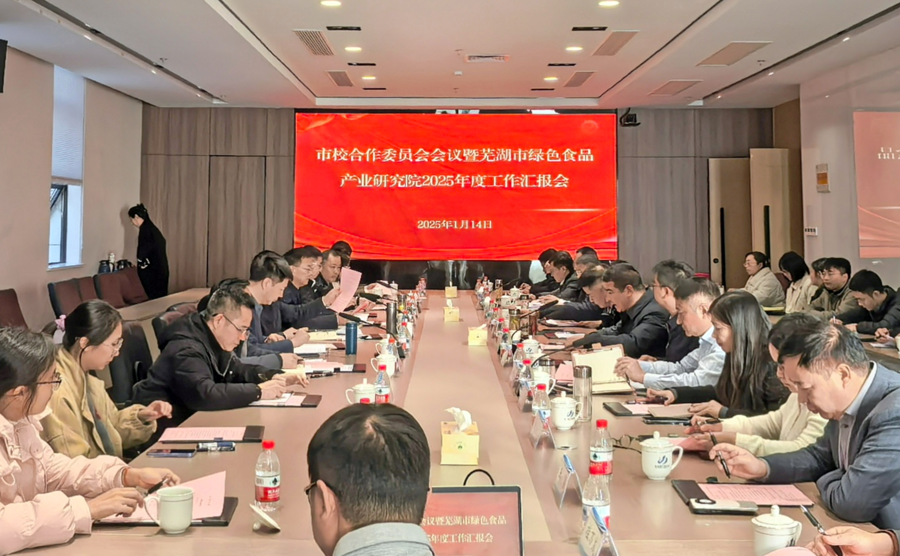 本网讯 1月14日,市校合作委员会会议暨芜湖市绿色食品产业研究院有限公司2025年度工作汇报会在无为经济开发区举行。校党委书记卢平,校党委副书记、校长黄友锐,校党委常委、副校长凤权;无为市委书记匡健,市委副书记、市政府市长束晓伟,市委常委、组织部部长刘求标出席。学校办公室、组织部、资产经营公司、生物与食品工程学院以及无为市相关部门负责人参加。会议由束晓伟主持。